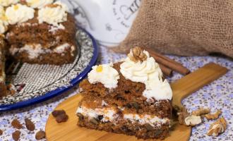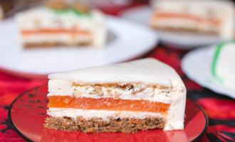 В оригіналі він звучить як Мандариново-морквяний торт: це ідеальне поєднання морквяного бісквіта, що тане в роті, морквяного желе, карамелізованих горіхів і легкого мусу з двома видами сиру: філадельфією та козячим. Загалом, уже з опису видно, що цей торт ідеальний!