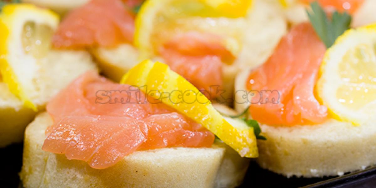 Це найпростіші і, мабуть, найсмачніші канапе. Класика жанру - лосось і лимон, і все це на тонкому шматочку багета. Смачно і святково, хоча такі канапе особисто я їла б щодня.