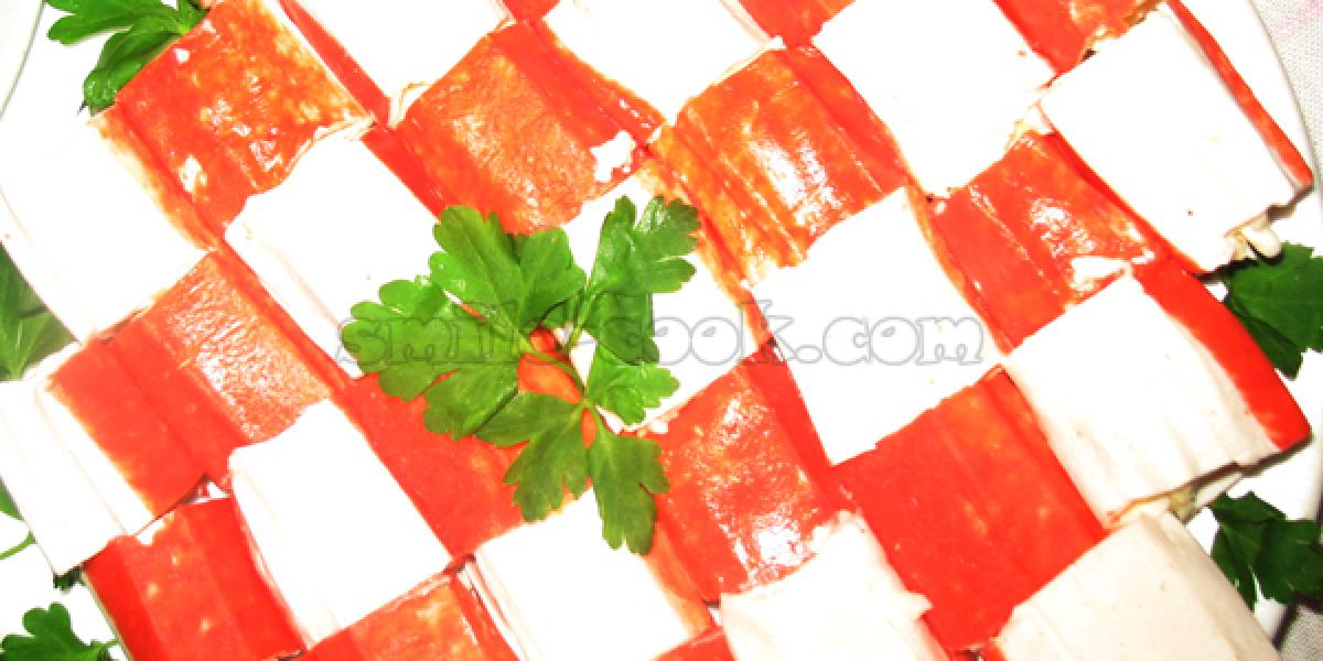 Крабові палички розкрутити, заповнити сумішшю і назад скрутити. Розрізати навпіл і викласти на блюдо.