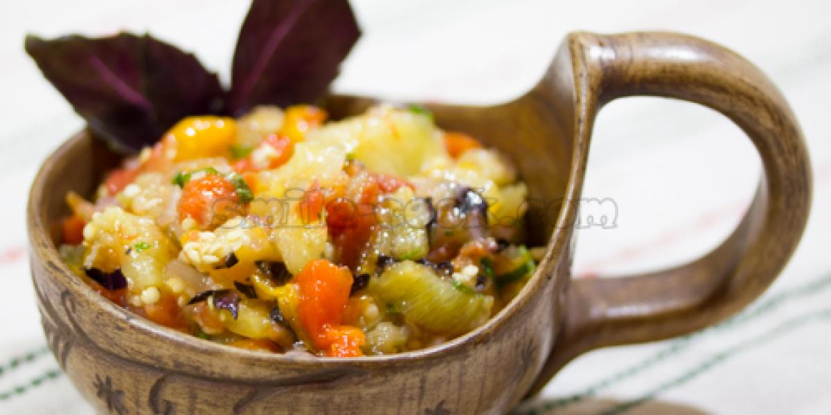 Рецепт цієї закуски з телепередачі "На ножах" я запримітила давно, проте весь час відкладала, оскільки він дуже нагадує рецепт ікри з баклажанів, а я її готую за своїм давно перевіреним рецептом. Але цей рецепт підійде і "виразникам" і тим, хто намагається харчуватися менш жирною їжею, оскільки олії в рецепті використовується менше, ніж зазвичай. До того ж закуска виходить яскравою та барвистою.